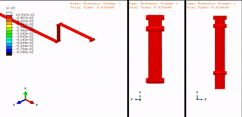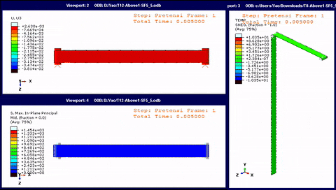 Sometimes in a modeling and analysis work, successfully simulating a problem is not easy, successful interpretation of results is harder. The latter requires a solid theoretical knowledge, a close experience of the physical problem, and the intuition formed by both. As a thorough understanding of problem is gained, articulation and representation of the understanding is also hard. Most of the finite element codes are focusing on improving the algorithm part, which is tries to provide a better tool to simulate more physical problems, accurately and efficiently. The post-processing part of those codes, which helps to articulate and represent our understanding, lags far behind. In this problem I developed a little Python script that can extract relevant data from ODBs of Abaqus and visualize them. Most of the time for the cambered web problem, the middle line of the cambered web can represent the movement and deformation of the web. So I specifically visualized the lateral displacement, slope, and curvature of the middle line of the cambered web between the two rollers (blue and red in the animated figures below). I think this helps us to intuitively “see” the deformation and boundary conditions related with beam theory.